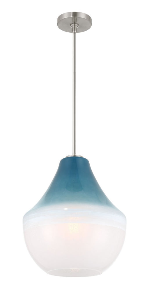 Details:Product Type: Glass DownFinish: Brushed NickelShade: Soft BlueMeasurements:Width / Dia: 14.00"Height: 16.50"Canopy: 5"x0.75"Weight: 4.65lbs...