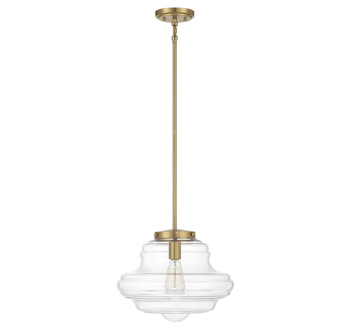 Bring a bold touch of vintage schoolhouse style to any space with this 1-light pendant. It features a natural brass finish and a curving clear glas...