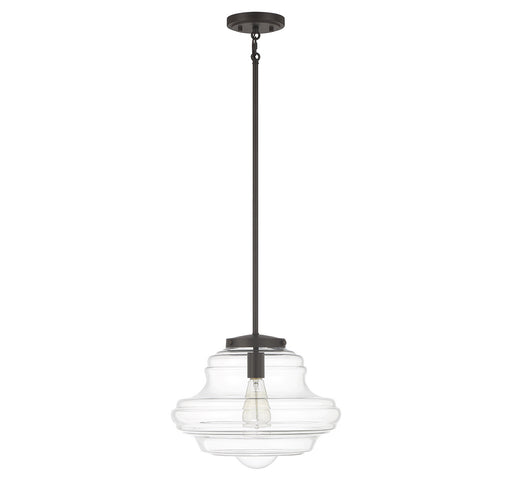 Bring a bold touch of vintage schoolhouse style to any space with this 1-light pendant. It features an oil rubbed bronze finish and a curving clear...