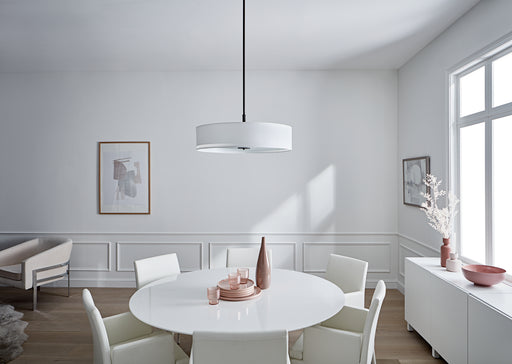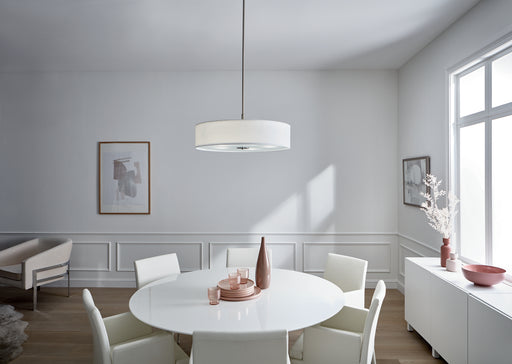 This 5 light transitional pendant features a pleasing drum shape in a Brushed Nickel finish and White micro fiber shade.Details:Product Type: Drum ...