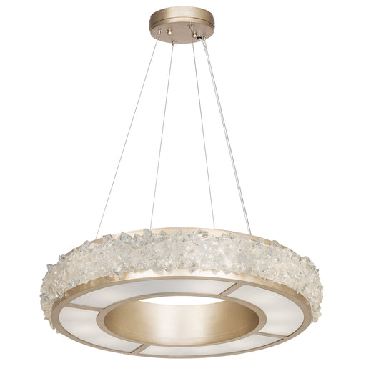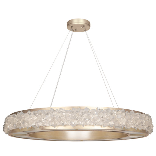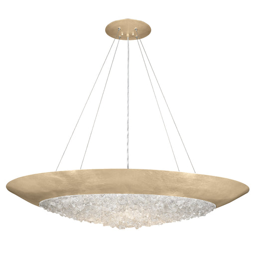 Pendant in a champagne tinted gold leaf finish featuring hundreds of rough cut crystal glass gems that refract light in a manner reminiscent to the...