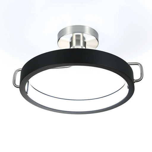 A black ring of LED light is suspended by two satin nickel or gold-finished metal rods on either side. An unconventional approach to a simple conce...