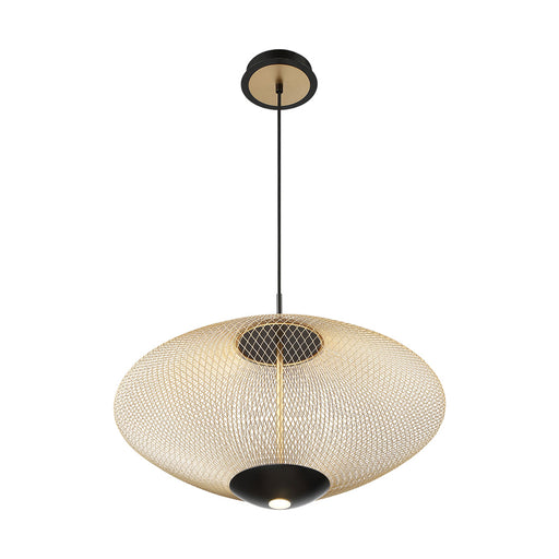 An oblong gold mesh pendant adds a soft velvety texture to the body. The LED lights that shine from the center offers bright illumination despite i...