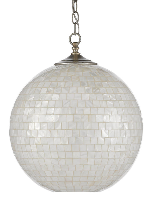 The Finhorn Pendant has an orb shape covered with small squares of mother of pearl. The metal affixing the globe pendant to the canopy, in an antiq...