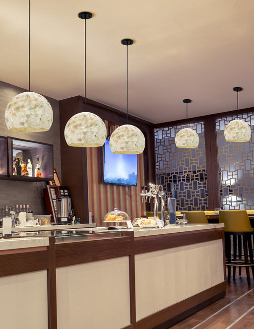 Large 1-Light PendantDetails:Product Type: Glass DownFinish: Dark BronzeShade: Shaved Alabaster Rocks Cast Into ResinMeasurements:Width / Dia: 10.5...