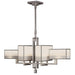 Oblong chandelier in a warm muted silver leaf finish and hand tailored laminated shades of multi-tonal white crepe and coordinating trim. Includes a 6' adjustable rod. Also available in patinated golden bronze finish: 734040. Canopy adapts to vaulted ceiling.