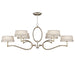 Oblong chandelier in a platinized silver leaf finish with subtle brown highlights and white textured linen shades with pierced metal gallery in matching silver leaf finish.