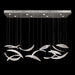 Elevate raises your environment to new heights. Each "plume" is handblown and sculpted with a translucent mixture of clear crystal and opaline glass accented by our signature dichroic glass, creating a shimmer of color in each ray of light. Illuminated from a silver leaf canopy and suspended by adjustable cables, this Made in America rectangular fixture features 15 handblown glass "plume"s and is ideal for low ceilings. Shown in a "horizontal" design.