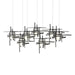 This 7-Light Tura with its rectangular canopy is a linear multi-port pendant, with both depth and dimension. Each intersecting piece is crafted from from annealed aluminum that are hand textured using a trip hammer and custom dies. This Tura Pendant's shades are made of simple, thick cylinders of frosted glass. Available in all standard finishes.