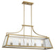 Lantern-style lighting gets a stylish twist in the Elias 5-light linear pendant. Panes of clear ribbed glass create intriguing texture to go with the warm brass finish. Elias is 42" in length, 13.75" in width and has an adjustable height that ranges from 21.5" to 75". Uses 5 standard size bulbs of up to 60 watts each (bulbs not included). Comes with eight 12" downrods and two 6" downrods.