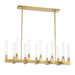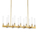 12-Light 40" Arm Styled Linear Chandelier with Clear Fluted Cylindrical Glass Shades Settled on a Sleek Aged Brass Arm Styled Frame.