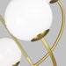 The Galassia four light single tier chandelier by AERIN in burnished brass balances glass globes on an elongated frame, which gives it a contemporary look. The white glass casts a soft, welcoming glow, while the elongated frame works particularly well in large, high-ceiling rooms.