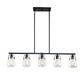 The Skybridge island pendant light has bright glass goblet shades that highlights the Black finish on this five-light linear fixture. The unique saddle style glass holder and geometric lines complement any transitional or modern design. 42 inches length by 5 inches width, the Skybridge island pendant light is the perfect light source over a kitchen island or in a linear design application.