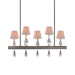 6-Light 36" Linear Candle Chandelier with Lamp Style Clear Crystal Candle Bases and Off White Linen Mini Shades. Polished Chrome Finished Sleek Linear Frame with Clear Faceted Tear Drop Crystals.