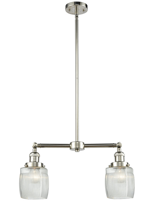Colton - 2 Light - 22 inch - Polished Nickel - Clear Halophane Shade - Stem Hung - Island LightDetails:Product Type: 2 Light BarFinish: Polished Ni...