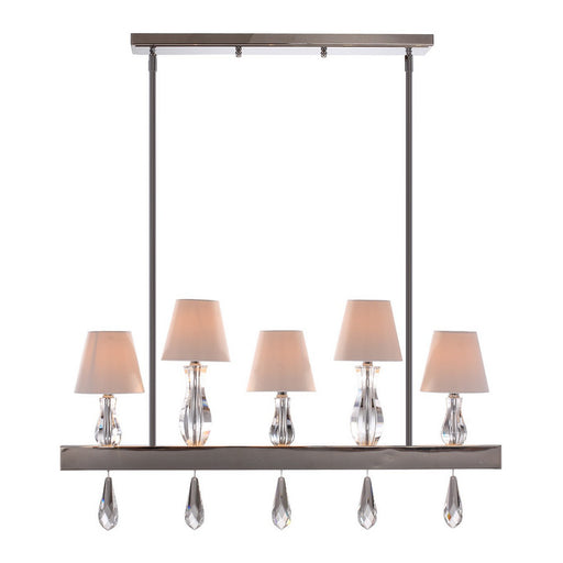 6-Light 36" Linear Candle Chandelier with Lamp Style Clear Crystal Candle Bases and Off White Linen Mini Shades. Polished Chrome Finished Sleek Lin...
