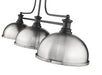 A subtle industrial vibe and brushed nickel and matte black finish pairing flatter this three-light billiards pendant from the Mélange collection by Z-Lite. A simple yet fluid silhouette blends matte black steel and dome-shaped brushed nickel steel shades forming a perfectly balanced profile. This charming fixture is an ideal solution to brighten a kitchen island or sports room billiard space.