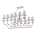 12-Light 48" Linear Armed Chandelier with Clear Glass Arms with Bobeches, White Linen Fabric Horns Shades and Polished Chrome Metal Finish.
