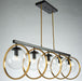 From the Lighting Pulse design firm, this Lugano collection 5 light linear island chandelier features clear round glassware which is complimented by vintage brass encasings on a black frame.