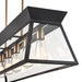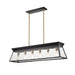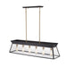 The Lucian collection, designed by Kevin Kraemer, is a modern twist on a classical lantern style light. Shown in black with brass accents (also available in a rich plated brushed brass). Clear panel glassware surrounding the bulbs. The model shown is a linear island chandelier which comes with extra rods for easy height adjustment and has a hangstraight to be compatible with sloped ceilings. Great for any table or island area.
