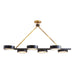 Minimalist modern and oh so cool. The six-light Linus Chandelier`s muted antique brass finish is perfectly complemented by its bronze details. The frosted glass diffusers serve dual functions creating softer light below and adding additional light to the chandelier`s frame spotlighting its bold bronze finish. Additional pipe available (PIPE-101). Approved for use in covered outdoor areas.