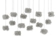 The Birds Nest Rectangular 15-Light Multi-Drop Pendant is an effervescent beaded pendant that looks like luminous nests. Rather than twigs, the shades are made up of whorls of clear beads strung along pieces of wire. It takes many hours for our artisans to create these shades that look so whimsical. The canopy of this piece is luminous in a painted silver finish. This fixture is among Currey & Company's multi-drop pendant collection, which includes multiple configurations.