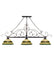 Emerald-colored jewels and Multi-colored granite glass accent this handsome Amber Beige art glass reproduction of a famous Louis Comfort Tiffany design. The fixture, which is ideal for illuminating billiard tables, kitchen islands and counters, features three Tiffany Roman shades inspired by Italian art and architecture and handcrafted using the copperfoil construction method. The Georgia Scroll hardware is finished in a hand-applied Mahogany Bronze. UL and cUL listed for damp and dry locations.