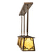 This handsome three light island fixture reflects the modestly adorned Bungalow style with shades of Bone Beige and Moss Green glass which are suspended from linear Antique Copper hardware.