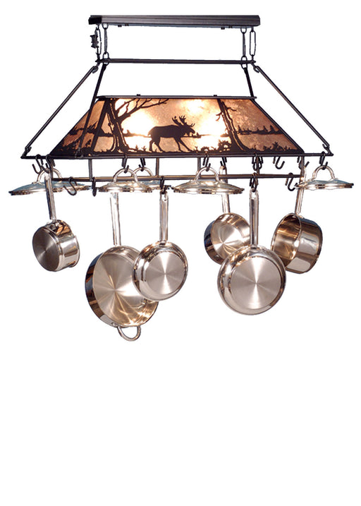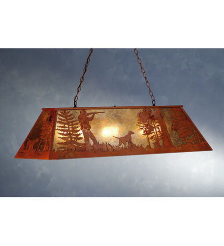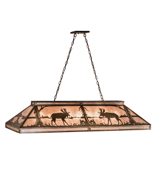 A pair of Moose wander by a lake in the woods on this nature inspired oblong pendant. The fixture is finished in Antique Copper, has Amber mica pan...