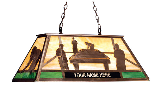 You can personalize this striking fixture by adding your business or family name to this billiard fixture shade. The fixture features Beige Art Gla...