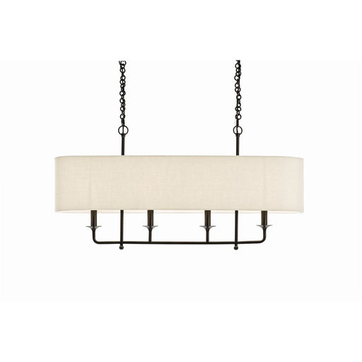Long and narrow 4-light pendant in steel with dark bronze finish features light beige linen fabric oval shade.Details:Product Type: 4 Light +Finish...