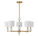 The Cardiff 5-light chandelier is a standout of New Traditional style, refreshing the timeless silhouette of a chandelier with intriguing new touches. Orbs of glass decorate the arms and center column, pairing nicely with the white fabric shades and harmonizing with the Warm Brass finish. Cardiff is 27" in width and has an adjustable height ranging from 16" to 70". Comes with four 12" downrods and one 6" downrod. Uses five candelabra size bulbs of up to 60 watts per bulb. Bulbs not included.