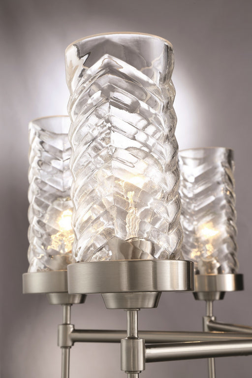 6-Light 26" Armed Chandelier with Individual Clear Wave Styled Cylindrical Glass Shade on a Brushed Nickel Decorative Metal Frame.Details:Product T...