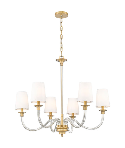Subtle decorative details are highlighted with a warm rubbed brass finish of this modern six-light chandelier. Slender arms are fashioned in glass,...