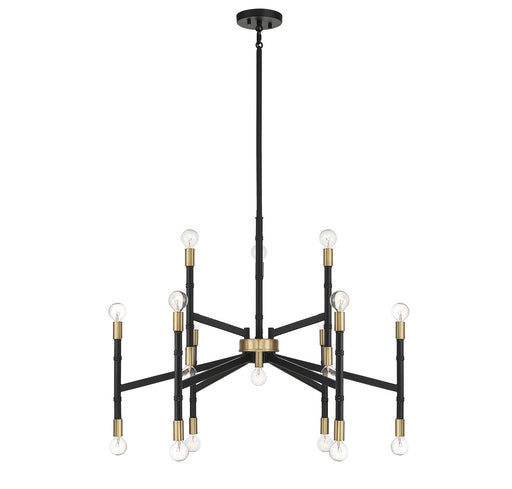 The Rossi 18-light chandelier makes a bold style statement with a simple, angular look. The matte black finish is paired with warm brass accents fo...