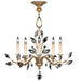 Chandelier in antique warm gold leaf featuring antique candlesticks and stylized faceted crystal leaves.