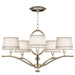 Chandelier in a platinized silver leaf finish with subtle brown highlights and white textured linen shades with pierced metal gallery in matching silver leaf finish.
