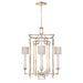 Executed by skilled metal artisans, this weathered griege patina chandelier is inspired by the 1920's unique transitional period in architecture & design in Cienfuegos. Also available in soft gold or antique bronze. Includes textured natural greige fabric shades.
