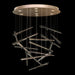 Elevate transcends your environment to new heights. Each glass spire is solid glass with contour carving and polishing and cased with a mixture of specialized crystalized silica to create a unique textural metallic surface. Illuminated from a gold leaf canopy and suspended by adjustable cables. This American handmade round fixture features 17 sculpted spires and is ideal for low ceilings.