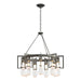 Gracefully held in place by detailed steel cuffs and a large circular frame, nine hand-blown hourglass vessels capture pools of downward light. The glass elements speak to the apothecary jars of an earlier time, while the metalwork reflects clean contemporary lines. The round Apothecary Chandelier is a part of Hubbardton Forge's Apothecary Collection, blending simplicity in form with richness in materials and finishâeasily adaptable to a wide range of styles.