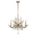 A love for outdoor style and the simple flow of a flowering vine is the design inspiration for this chandelier. Showing off our love for a traditional shape and a simple silver metallic finish, this elegant crystal chandelier from Lucas McKearn is perfect for a dining room, kitchen or bathroom application. Using the silver with an antique glaze mix, this chandelier's finished metal is formed into a beautifully curved frame that highlights clear hand-cut crystal accents, making this distressed champagne and crystal twelve light chandelier a must-have for your glamorous and sophisticated space.