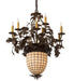 Visually impressive as a mighty Oak Tree, this Acorn art glass shade delights with multi toned Autumn Beige and a Bark Brown granite glass crown sprouting oak leaf and acorn hardware finished in Bronze. Nine faux candlelights with Beeswax candle covers on bobeches sprout from branch-like arms. The chandelier hardware was custom crafted by Meyda artisans at the foothills of the Adirondack Mountains. Custom sizes, styles and colors are available, as well as dimmable energy efficient lamping options.