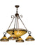 A large Tantalizing Beige art glass shade, accented with Amethyst swirled granite glass and ornamented with delicate filigree, is complemented with four matching art glass shades. The chandelier hardware is finished in a warm Mahogany Bronze and the shade is created using Meyda Tiffany's famous copperfoil construction process. Crestwood?s unique design exemplifies functionality and decorative beauty as the larger inverted shade features inner lamps for ambient lighting to display the beauty of the glass while the four smaller shades provide down lighting. Custom sizes, designs, colors and dimmable energy efficient lamping options are available. UL and cUL listed for damp and dry locations.