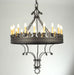 This handsome rustic styled chandelier is leaf adorned and lighted by a ring of wax like candelabras. The fixture with chain suspension, candles and Wrought iron finish, is reminiscent of ancient times. Handcrafted by highly skilled artisans in our 180,000 square foot manufacturing facility in Yorkville, NY. Custom colors, styles, and sizes available. Dimmable energy efficient lamping options offered. UL and cUL listed for dry and damp locations.