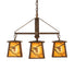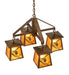 This linear four arm chandelier features metal bound lanterns with Pinecone and branch filigree over Amber mica panels suspended from linear arms. The hardware and all metal parts have an Antique Copper finish. This fixture is handcrafted in the USA by Meyda artisans.