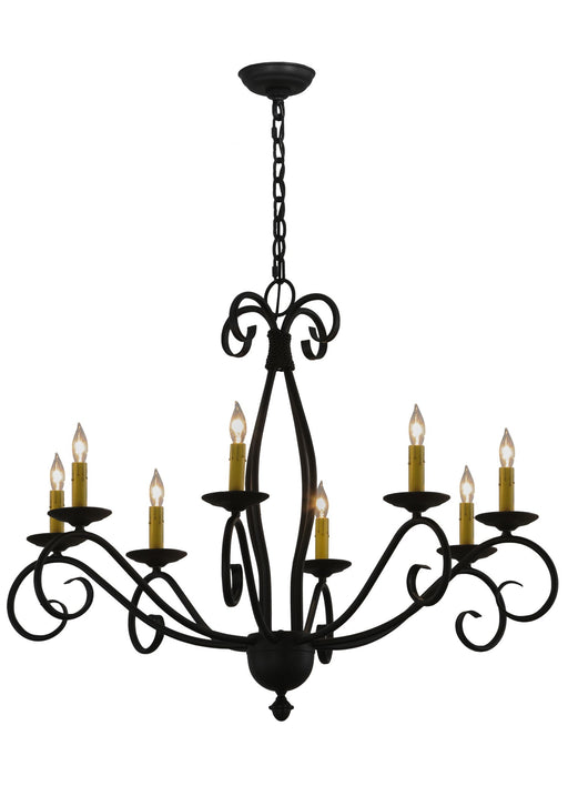 Beauty and grace come to light with this elegant chandelier highlighted with an elaborate scroll design. 8 Amber faux candlelights are perched on d...