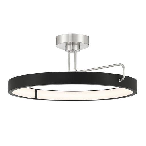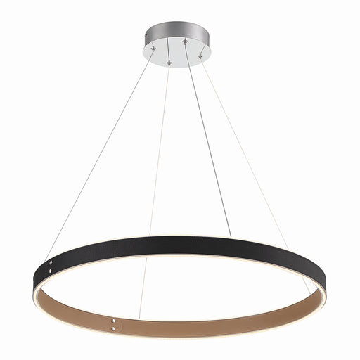 A black ring of LED light is suspended by two satin nickel or gold-finished metal rods on either side. An unconventional approach to a simple conce...