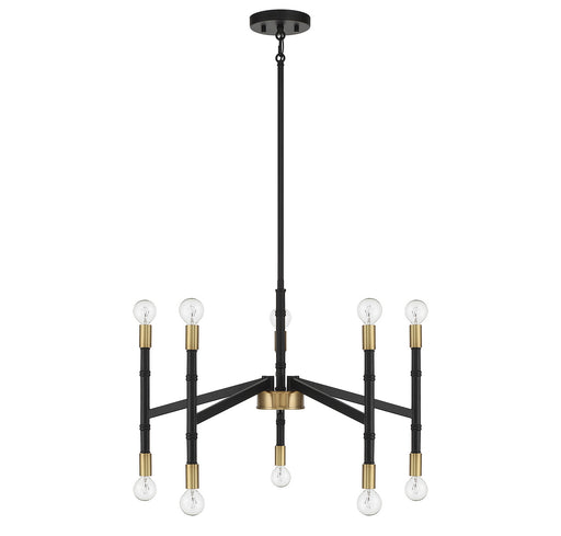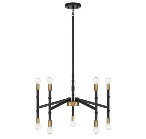 The Rossi 10-light chandelier makes a bold style statement with a simple, angular look. The matte black finish is paired with warm brass accents fo...