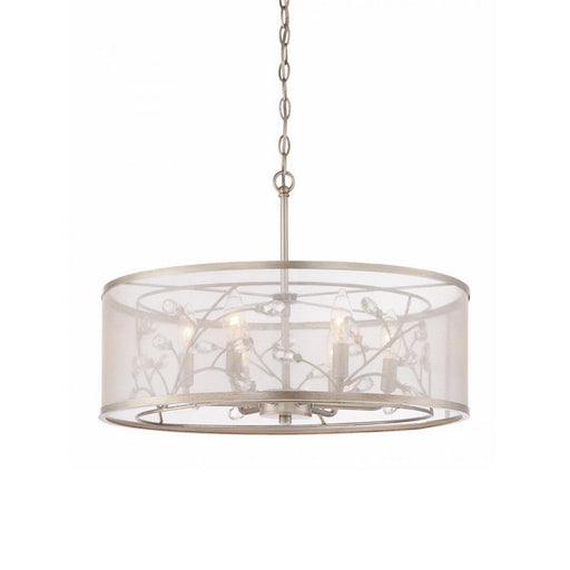 6-Light 21" Organic Drum Pendant with Silver Organza Drum Shade, Burnished Silver Finished Trim and Branch Styled Arms Completed with Clear Faceted...