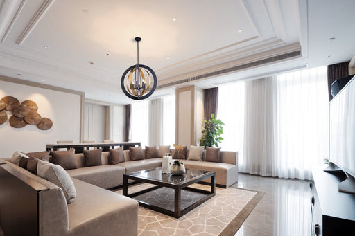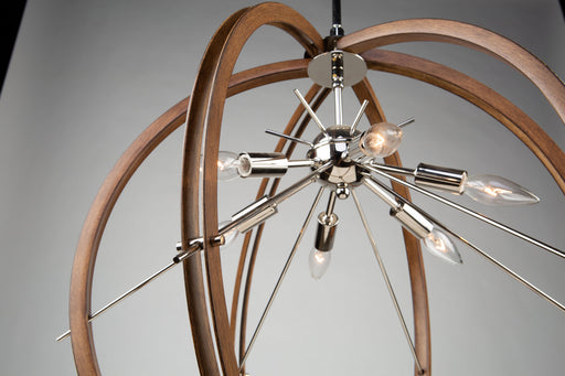 The "Abbey" Collection 6 light pendant features an orb type circular design. The exterior frame is made of metal but has a faux wood finish and is ...